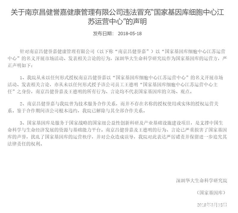 5月18日,国家基因库就此事发表了一篇声明,申明中表示:未以任何形式授权南京一家健康管理公司以“国家基因库细胞中心江苏运营中心”的名义开展市场活动、发表相关言论,亦从未以任何形式授予该公司员工王德明“国家基因库细胞中心江苏运营中心主任”之身份。
