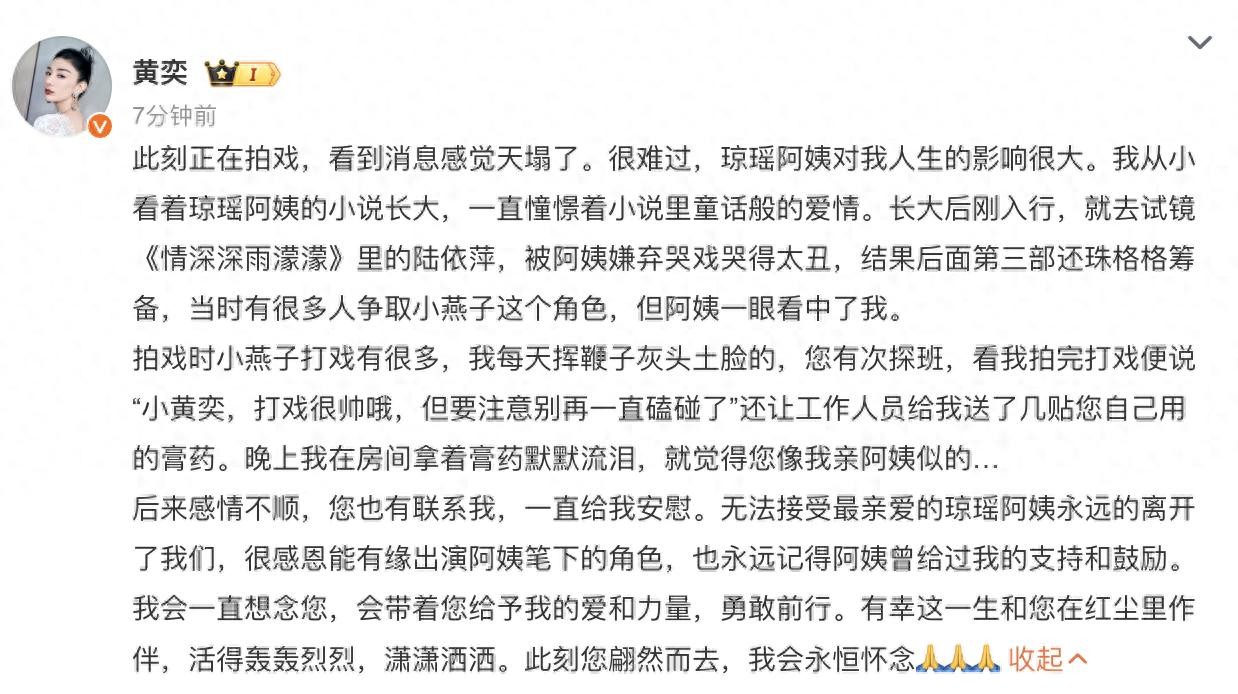 黄奕表示:“此刻正在拍戏,看到消息感觉天塌了。很难过,琼瑶阿姨对我人生的影响很大。我从小看着琼瑶阿姨的小说长大,一直憧憬着小说里童话般的爱情。长大后刚入行,就去试镜《情深深雨濛濛》里的陆依萍,被阿姨嫌弃哭戏哭得太丑,结果后面第三部《还珠格格》筹备,当时有很多人争取小燕子这个角色,但阿姨一眼看中了我。拍戏时小燕子打戏有很多,我每天挥鞭子灰头土脸的,您有次探班,看我拍完打戏便说‘小黄奕,打戏很帅哦,但要注意别再一直磕碰了’还让工作人员给我送了几帖您自己用的膏药。晚上我在房间拿着膏药默默流泪,就觉得您像我亲阿姨似的……后来感情不顺,您也有联系我,一直给我安慰。无法接受最亲爱的琼瑶阿姨永远的离开了我们,很感恩能有缘出演阿姨笔下的角色,也永远记得阿姨曾给过我的支持和鼓励。我会一直想念您,会带着您给予我的爱和力量,勇敢前行。有幸这一生和您在红尘里做伴,活得轰轰烈烈,潇潇洒洒。此刻您翩然而去,我会永恒怀念。”