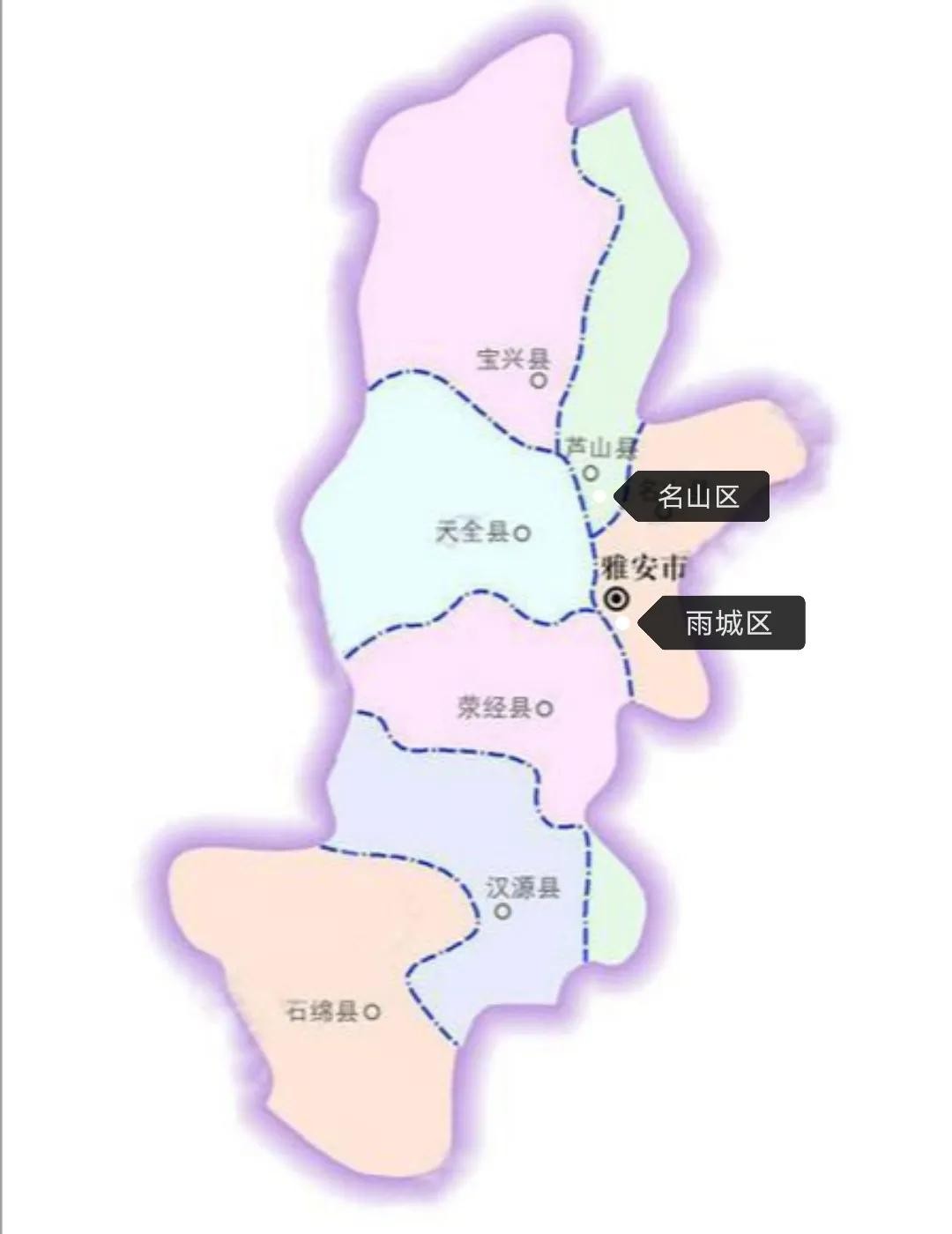 雅安市辖2个区、6个县。2个区为:雨城区、名山区,6个县为:荥经县、汉源县、石棉县、天全县、芦山县、宝兴县。