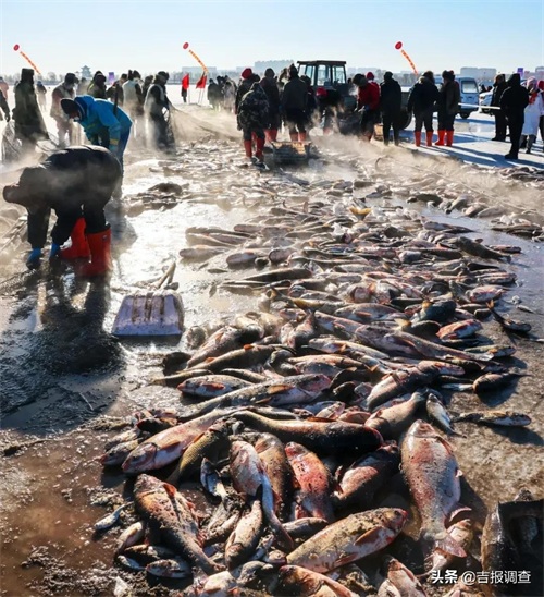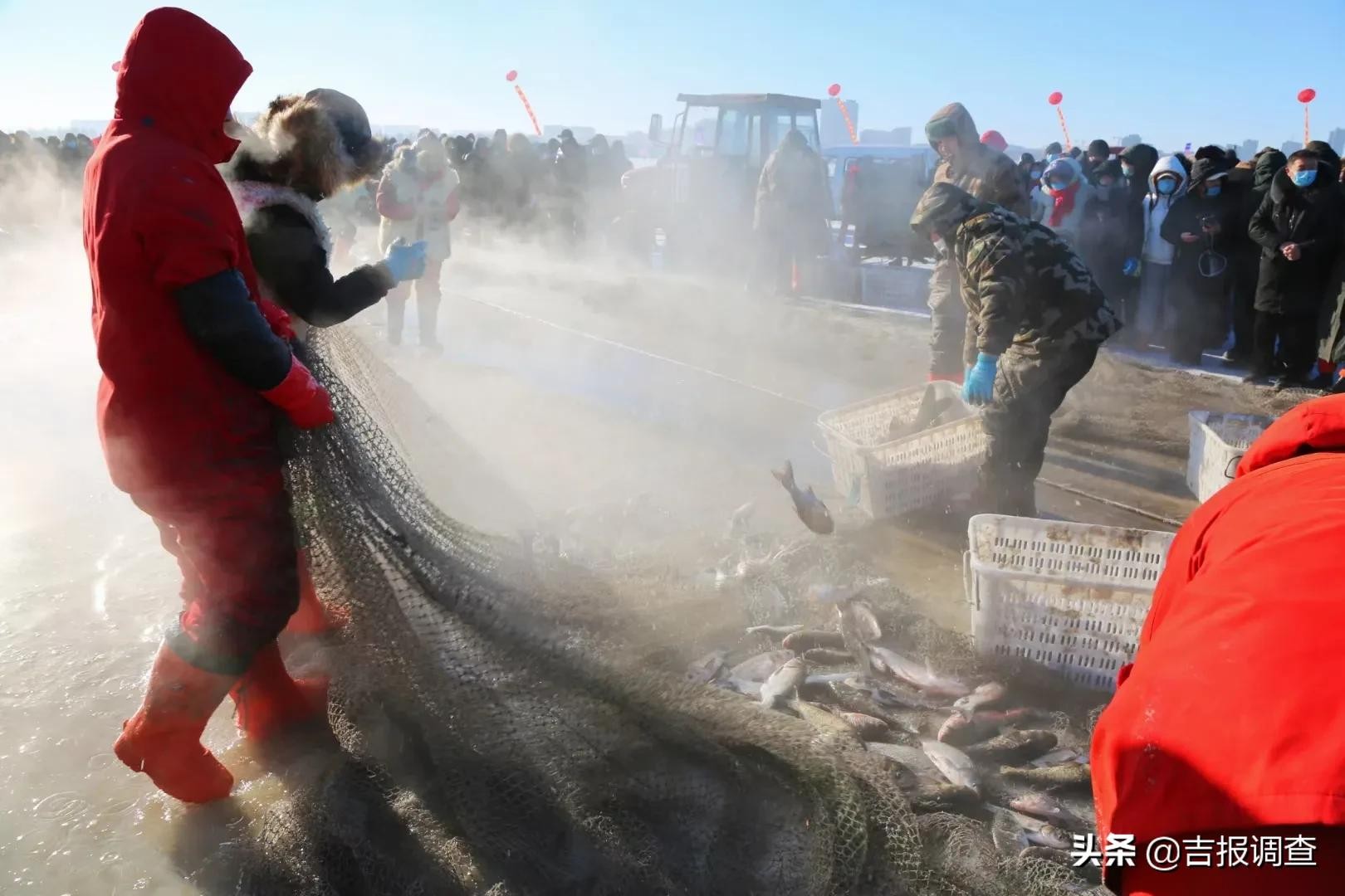 厚厚的湖冰被凿开了几个大洞,随着渔工将渔网慢慢拖出,成堆的鱼跳跃而出……近千年历史的查干湖冬捕如约而至。
