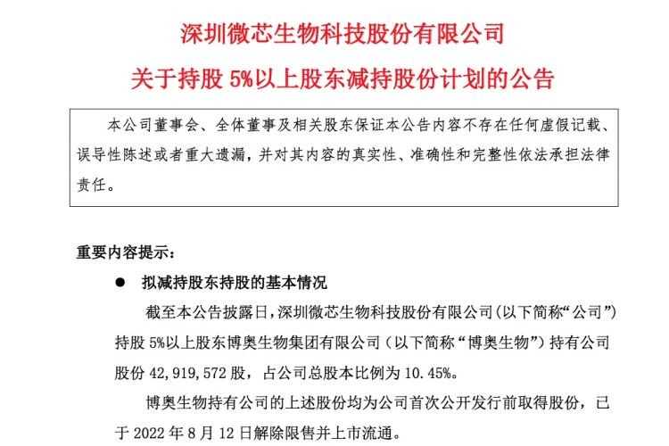 博奥生物持有的42,919,572股为微芯生物首次公开发行前取得股份,已于2022年8月12日解除限售并上市流通。
