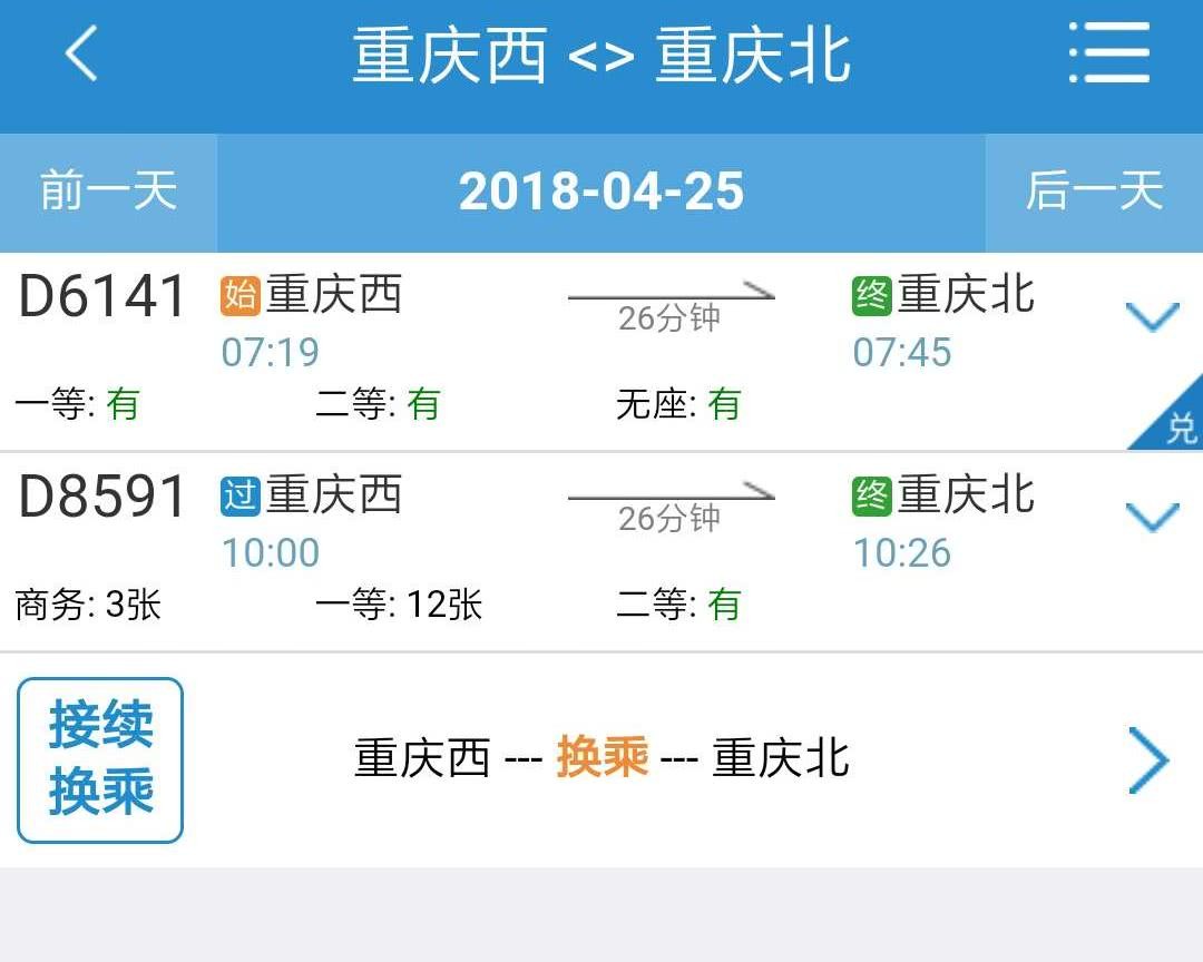 每天有两趟列车同时经过重庆西站和重庆北站,二十多公里的路程只要26分钟,二等座票价15元,一等座票价25元,是不是很方便呢。D6141次列车是为西站和北站特意开通的一列专车,全程只有这一个站。除了方便换乘的乘客,对于早高峰时的上班族也是很方便。D8591次列车是直接从贵阳始发站发过来的列车,全程票价129元,历时3小时左右,贵州的乘客就能到达重庆北站。