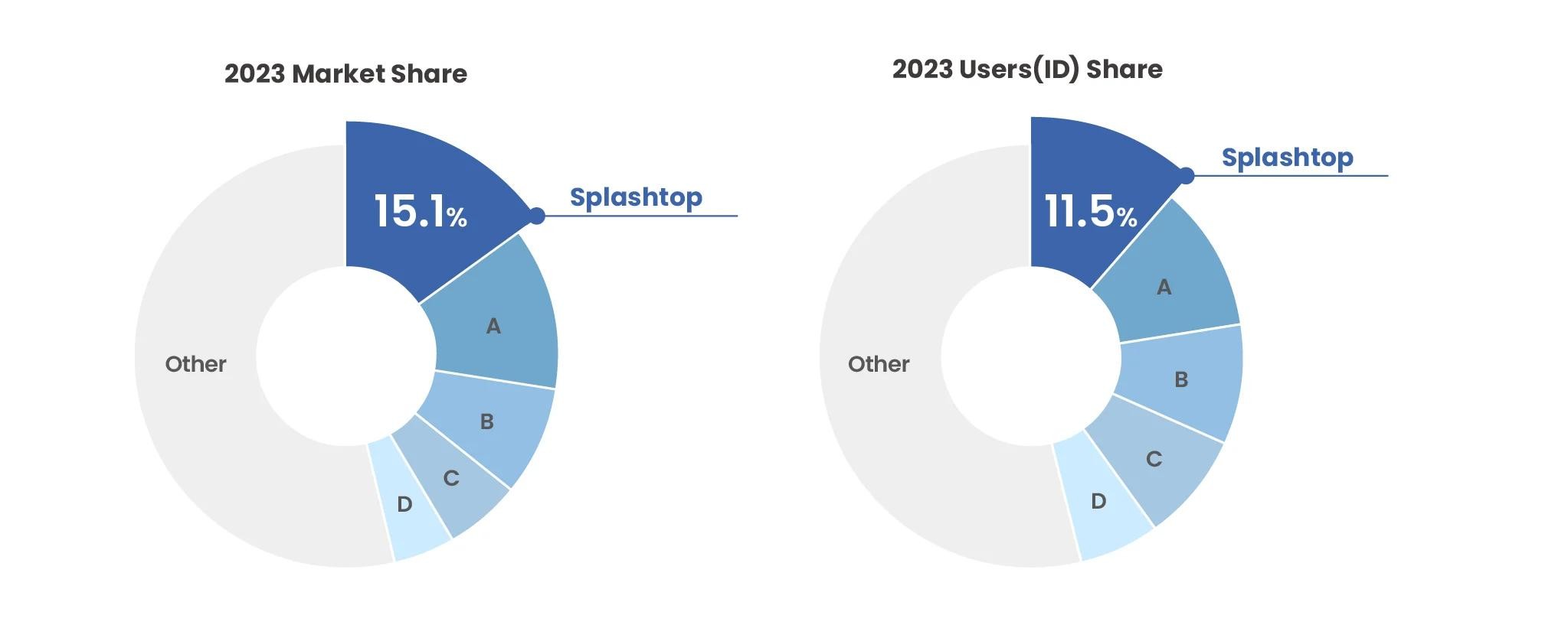 在该报告评估的远程访问服务中,Splashtop 在2023财年的营收排名第一(预计2024财年将继续保持),市场份额占比15.1%。Splashtop 的用户( ID )数量也排名第一,2023财年用户( ID )数量占比为11.5%。